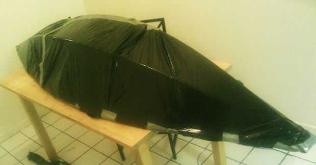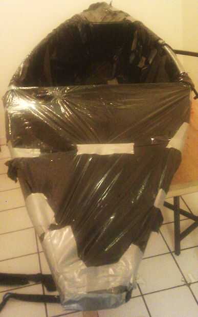 Ahora que el cuadro está completo, cubrir el kayak en bolsas de basura con cinta para tubos marca Scotch para garantizar las bolsas a las tuberías. Asegúrese de dejar la parte superior del kayak entre abierto Cruz-llaves y sellar el espacio entre las abrazaderas de Cruz superior y las inferior Cruz-llaves. Para lograr esto, las bolsas de abrir y un borde a una pieza del bastidor de la cinta. Envuelva las bolsas alrededor del marco, grabar y recortar en caso necesario. Cuanto más haces, más fácil será para el kayak en el paso siguiente. La capa de plástico no sólo proporciona una capa adicional de impermeabilizante de su kayak, pero impide que las cosas se peguen en el interior del kayak una vez que usted agregue la piel de la cinta de conducto.