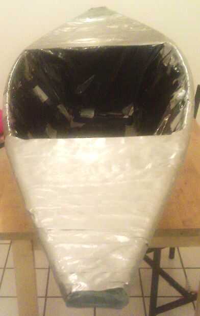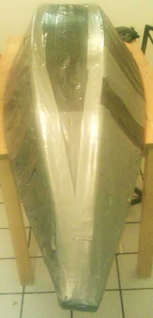 Agregue cuidadosamente tiras superpuestas de cinta Scotch marca resistente al exterior del kayak hasta que las bolsas de basura están totalmente cubiertas (no es necesario grabar el pozo donde se sentará). Me pareció lo más fácil de añadir primero las tiras longitudinalmente en la parte inferior de la piragua y luego verticales tiras a los lados (de atrás hacia delante) con el fin de minimizar el plegado de la cinta. Entonces añadí una tira adicional de la ficha de conducto en la parte inferior donde los paneles laterales terminaron para el refuerzo y para asegurar los paneles laterales no desprenda. Por último, añadí cinta adhesiva a la parte superior del kayak.