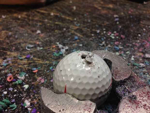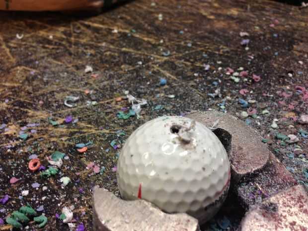 [Durante este proceso de orificios en la bola de golf te sugiero usar una mascarilla para protegerse de los gases expuestos durante la perforación. Su rancio muy malo para tu salud] la seguridad primero!