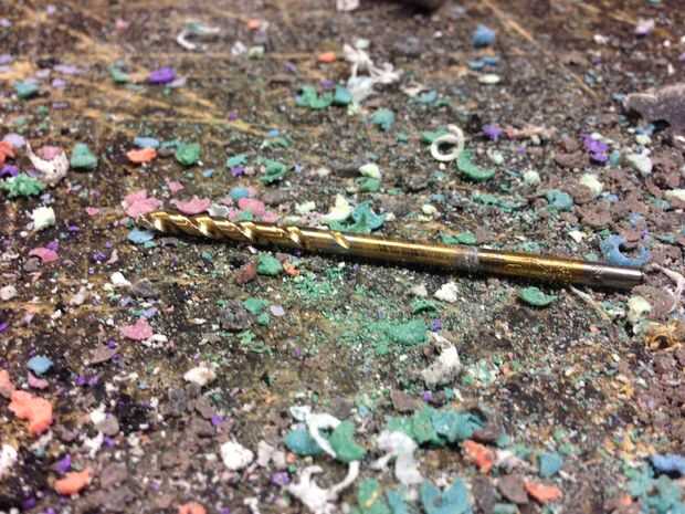 3. después de perforar el agujero piloto siga a través con otro pedacito de taladro. (15/64 broca)