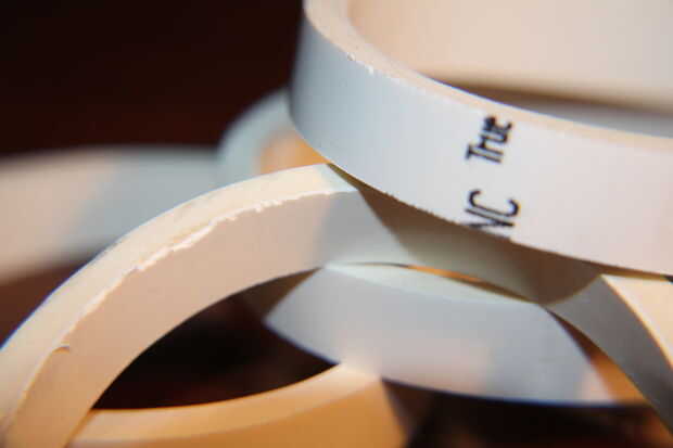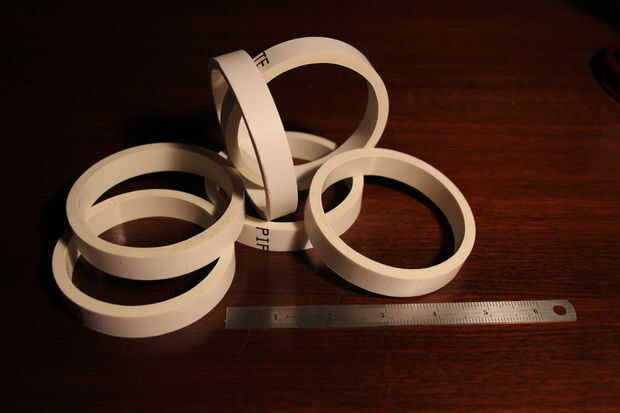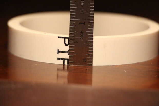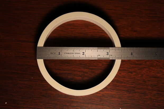 Cortar anillos que son aproximadamente 5/8" de ancho. Usando un seis pulgadas pedazo de tubo debe generar unos ocho anillos. Recuerde que el corte de sierra probablemente comerá hasta aproximadamente 1/8" de material. El tubo de muestra es de 6" de largo. También como se muestra en la ilustración, este tubo tiene un espesor aproximado de 1/4". Después de cortar varios, se verá como una pila de anillos de la ducha.
