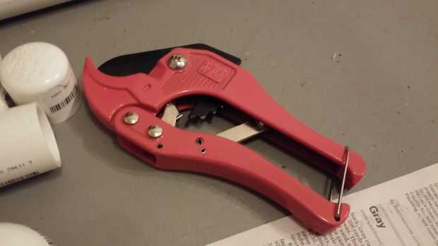 El cortador de PVC que se muestra a continuación es una herramienta bastante barata, pero funciona muy bien. Me resulta mucho más fácil cortar PVC con esto que con una sierra o cualquier otro método. El cortador tiene una acción de trinquete que permite varias veces cortar más y más en el material de la tubería, hasta que finalmente se cortar completamente a través. Recomiendo recoger uno si va a hacer más que uno o dos proyectos de PVC.