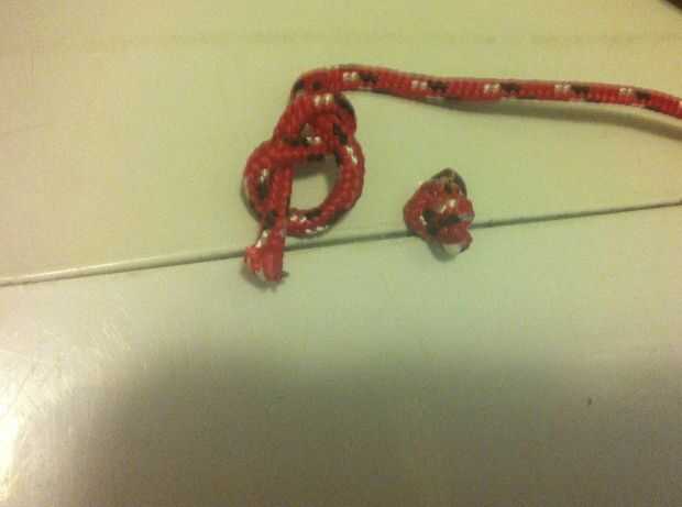 A continuación inserte el nudo en la garganta de la sección de tubería. Use una pequeña atadura como visto anteriormente para asegurar el nudo. Esta será nuestra parada de fricción.