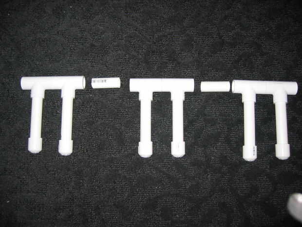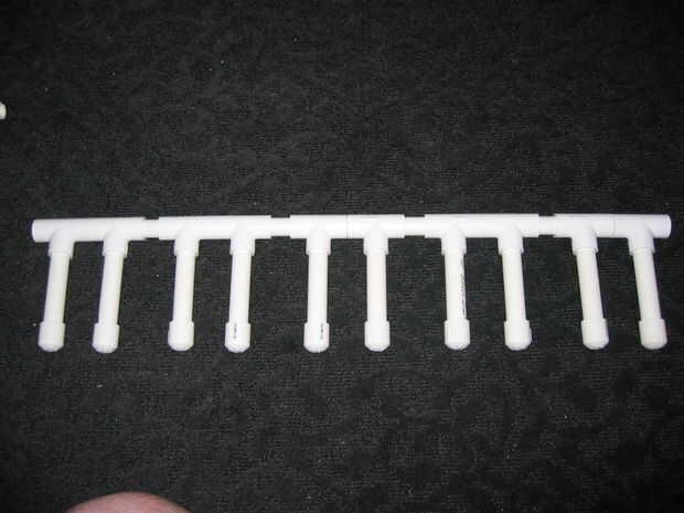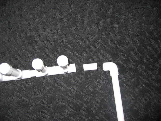 Tome cada uno de los titulares de cuello y conectar con otro con un 2 1/4" pieza (cuadro 1). Cuando haya terminado debe tener una fila de soportes de cuello (cuadro 2). Me pareció más fácil poner los soportes de cuello sobre una superficie plana cuando se conecta a todos. Esto asegura que todos los soportes estén alineados. Finalmente, conecte los soportes de cuello a las columnas en cada extremo con un 1 3/4" pieza (Foto 3).