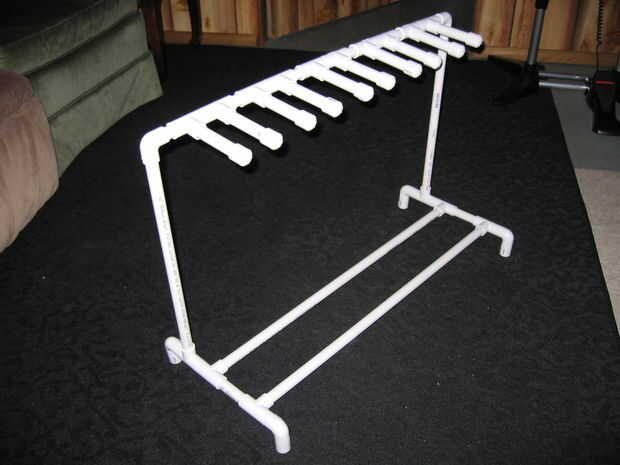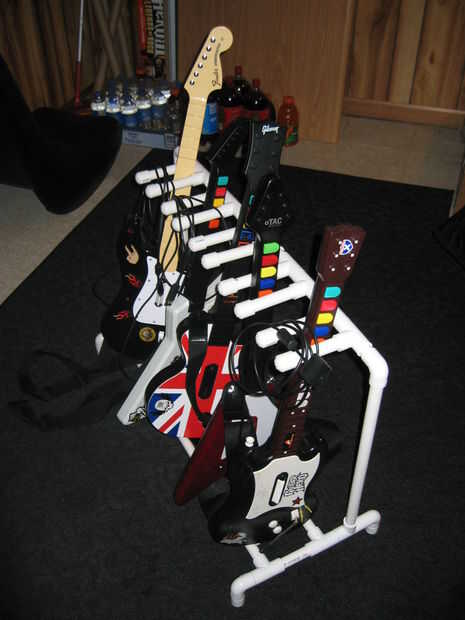 Puede modificar este diseño para sostener menos y más guitarras. Basta con ajustar las medidas y comprar más/menos T-conectores y casquillos de extremo. Si vas a hacer alguna más grande, recomiendo cortar los largos inferiores en el centro y agregar otro pie de apoyo (cerca de donde la guitarra media es en la segunda foto). El PVC tiende a combarse con el tiempo a pesar de que las guitarras no pesan mucho.