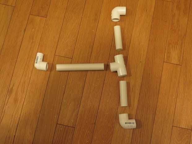Necesitarás: 5-T PVC accesorios, accesorios de PVC de 4 esquinas, 2-tapas, pieza 1 Cruz, 1 - 1 1/4 "x 1 1/2" acoplamiento, 1 - 1 1/2 "x 2" de acoplamiento, 1 - 2 "x 3" de acoplamiento, 1 - 2' 2" tubo de PVC, 2 - 10' 1 1/