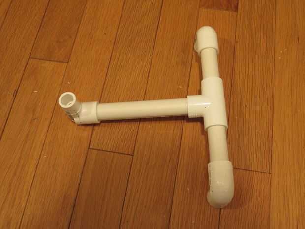 La base está hecha de uno 6" tramo de tubería, tubería de 3" dos piezas, dos codos de 90°, codo 90° uno y una tee. Van juntos en forma de t con el codo apuntando hacia arriba y los dos codos apuntando hacia abajo, estos actúan como patas para impartir una pequeña inclinación hacia atrás a la base para la estabilidad.