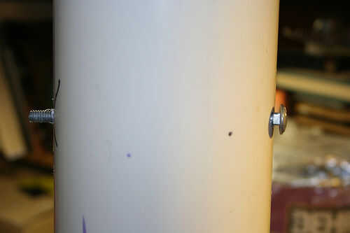 La broca que utiliza no fue tiempo suficiente para perforar el diámetro de la tubería. Para medir la longitud de un extremo de la tubería y marcas de trazado alrededor al otro lado, usted puede globo ocular, como nada en este proyecto se hizo para una medición exacta. Taladre los agujeros en ambos lados e Inserte los 2 pernos y fije las tuercas.