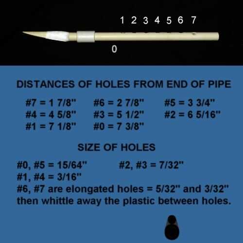 Las distancias entre los agujeros se copian desde un registrador del soprano.    Los orificios no están todos colocados en la línea del centro hacia abajo de la tubería.  Algunos dedos son más largos que otros, los agujeros tienen un pequeño desplazamiento hacia los lados para aumentar la comodidad durante la reproducción.  Cuando dibujante agujeros, sujete el tubo mientras jugando para encontrar y marcar un desplazamiento del lado cómodo para cada agujero del dedo.