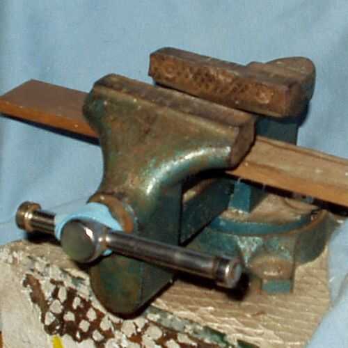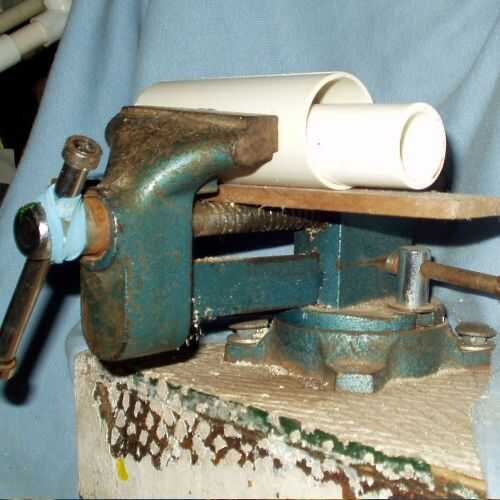 El plástico será calor formado directamente sobre el tornillo de banco, con un trozo de tubo en su lugar para asegurar un tubo de ese diámetro caben en él más tarde. Para trabajar rápidamente cuando llegue el momento, asegurándose de que el tubo va sólo tan profundo como desee, una pieza de madera se coloca en la zona de la mandíbula para el plástico caliente a fondo contra.