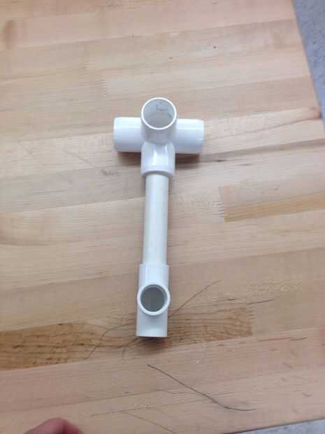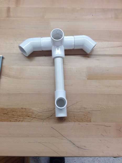 Una de las secciones de 6" con una tapa de acople al borde de un tee de 4 vías 1". Conectarse un tee de 3/4" de la parte inferior de la 6" pieza. Colocar 2 codos de 45 º a los lados de la 1" 4 vías" t "con dos 2" piezas de 1" PVC.