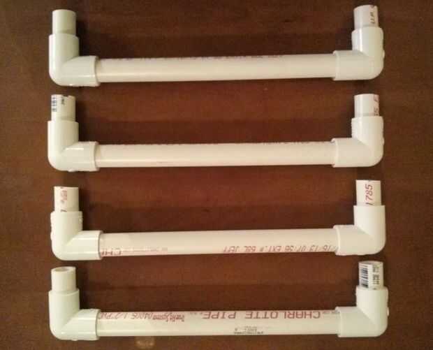 Ahora que ya tenemos todos nuestros codos se unieron, nos podemos Sujete juntos utilizando el restante 4-10" corte los trozos de tubo. Cuando adjuntarlos, asegúrese de que tener los codos en la misma dirección y empuje en lo pueden con la mano. Cuando termine, debe tener cuatro brazos montados como se muestra en la segunda foto de arriba.