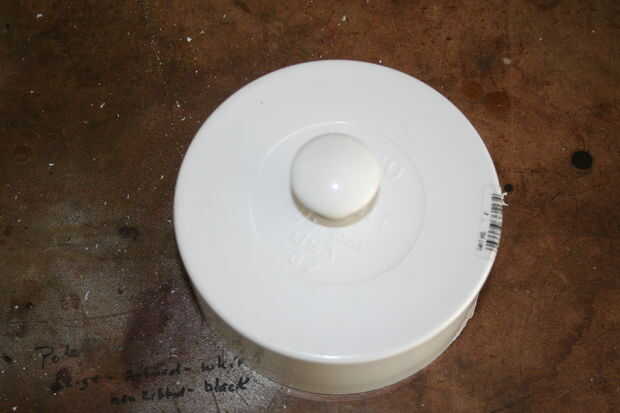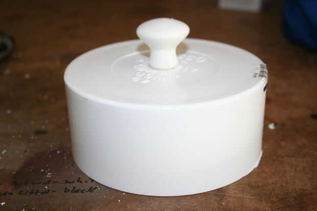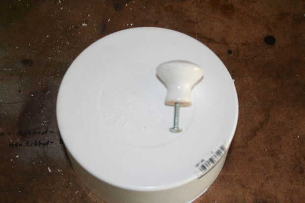 Bastante simple... Perfore un orificio de 1/8 de pulgada en el centro de la tapa e insertar tornillo y perilla.