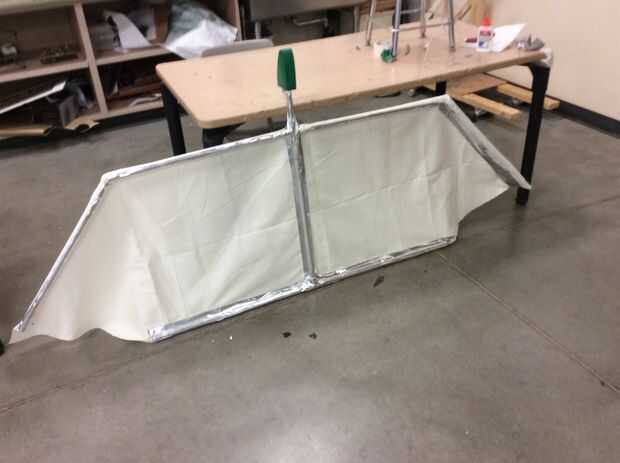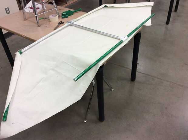 Para el montaje final, eliminar cualquiera de las alas del prototipo acabado pintura PVC y volver a montar el esqueleto. En primer lugar, hacer un esbozo de las alas en la lona. Nos dio las alas de lona un extra 3/4s de una pulgada de margen de maniobra y luego cortar la forma que remontar todo el esqueleto. Luego se utilizó una pistola de clavos para sujetar la lona en PVC y conducto de cinta, para cubrir las uñas y hacer un acabado sólido. Ahora usted tiene su propio planeador.