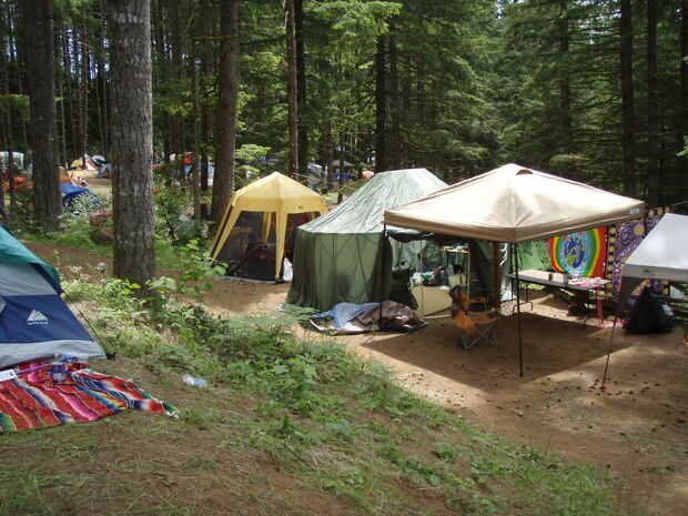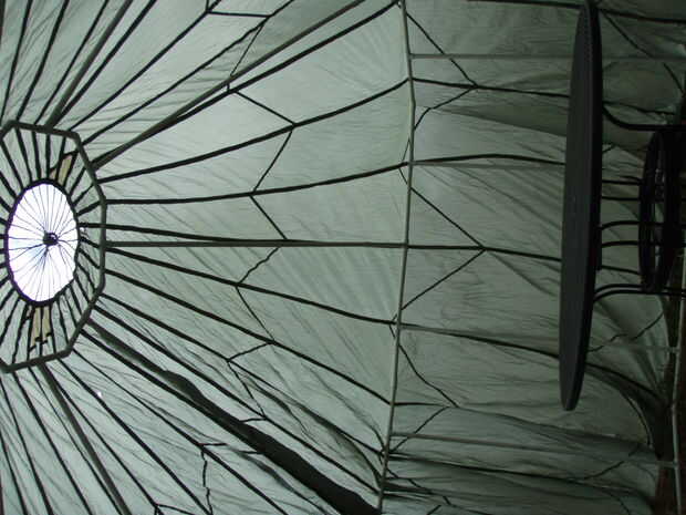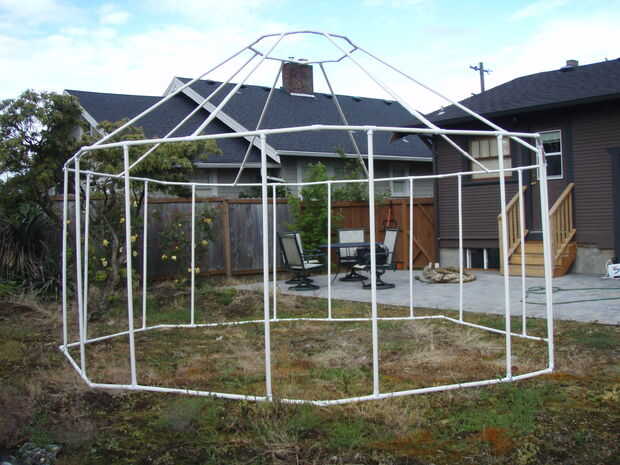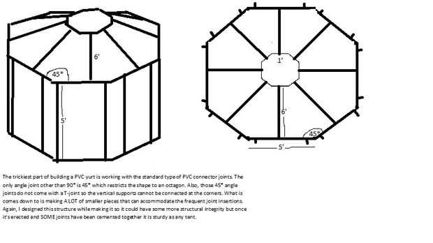 Aquí está una solución a sus necesidades de estructura de sombra camping barata, fácil y divertida! Todo esto le costará alrededor de 200 dólares y el valor de una tarde de corte de pvc. ¿El resultado? un diámetro de 12 pies, yurt octogonal que cabe en una bolsa de snowboard para el transporte fácil. Usé un paracaídas ($60 incluido en el costo total) para cubrirlo que funciona muy bien en cuanto a tamaño pero no es muy transpirable para rodar hacia los lados ayuda durante el día.