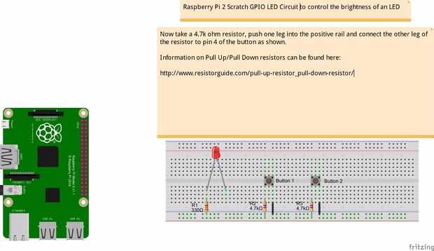 Tome un resistor k 4.7 y empuje una pierna en el carril positivo (color rojo) y empuje el otro extremo de la resistencia en la misma línea que la pata 4 del botón (la pierna izquierda del botón), repetir este proceso para el otro botón)