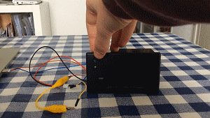 Para imprimir la página de prueba, desconecte la impresora de la fuente de alimentación y luego vuelva a conectarlo otra vez mientras mantiene pulsado el botón como se muestra en la imagen Gif animada. La impresora debe imprimir una tabla de códigos de carácter, y se conectó el voltaje de la impresora, entre otras cosas.