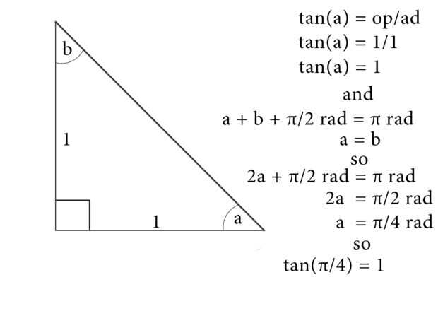 A continuación tenemos que encontrar una manera de relacionarse el arctan fórmula con π. tan (x) es la relación entre el lado opuesto al lado adyacente en un triángulo de ángulo recto con el ángulo x, por lo que si queremos que esta relación sea 1, un todo agradable redondo número, entonces los lados opuestos y adyacentes del triángulo deben ser de igual longitud. Se trata de un triángulo rectángulo isósceles, un ángulo es un ángulo recto, y los otros dos deben ser iguales. Sabemos que todos los ángulos de un triángulos deben agregar hasta radianes π (esta es la regla equivalente a medida todos los ángulos de un triángulo agregan hasta 180 °), y un ángulo π/2 radianes (el ángulo recto). De esto que podemos calcular que los otros dos ángulos deben agregar hasta π/2 radianes, así que cada uno debe ser π/4 radianes. Así que ahí lo tenemos, para la relación entre el lado opuesto y adyacente de un triángulo que uno, el ángulo del triángulo de ángulo recto debe ser π/4 radianes, en otras palabras: