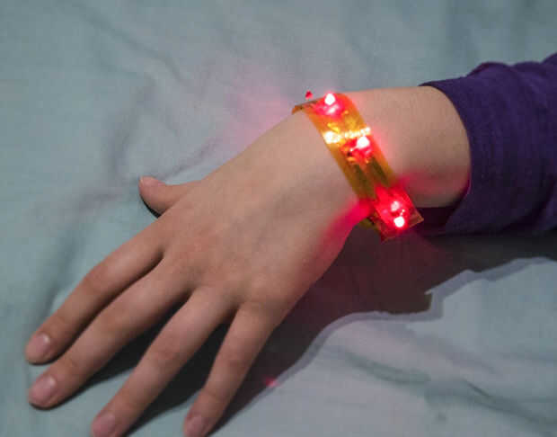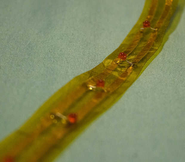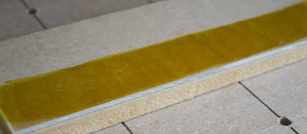 Primero pegué el Kapton cinta una pieza de acrílico para la eliminación fácil después. Terminé 3 piezas de Kapton uno encima del otro para dar el circuito cierta rigidez y espesor de capas. Cinta de Kapton es realmente muy fino. Me pareció más fácil de usar un tubo de cartón para rodar la cinta en. Burbujas de aire pueden ser molestas pero no parecen obstaculizar la función demasiado, pero aún mejor tratar de evitarlos.