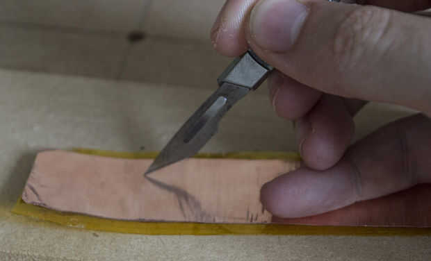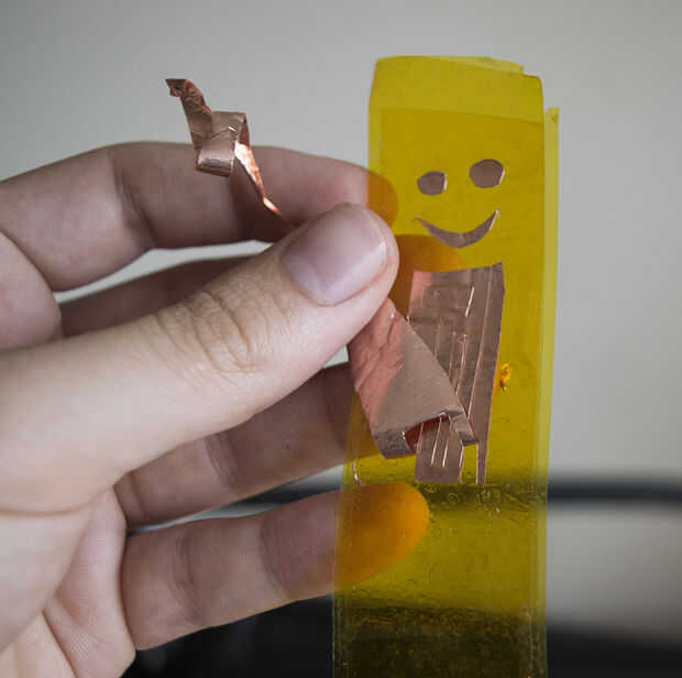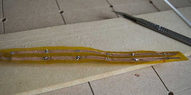 Para hacer un circuito simple, he utilizado un cuchillo para cortar un diseño y luego a había pelado el cobre innecesario. También he podido aplanar la Pyralux DIY bastante un diseño de la máquina y hacer un circuito de trabajo usando LED y una pila de monedas. Para soldar en el cobre era simple y no me da ningún problema. La prueba final sería desarrollar químicamente un circuito con solución de grabador. No sé si el adhesivo de la cinta soportar el desarrollo de química pero no tenía ningún grabador para probar esto.
