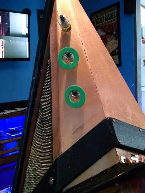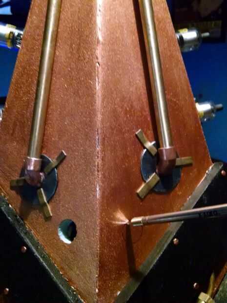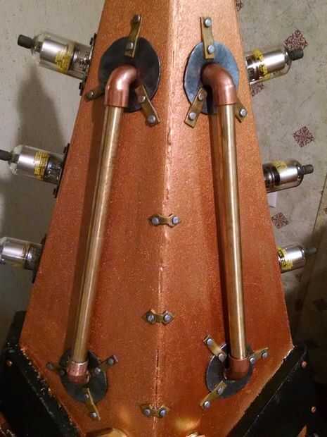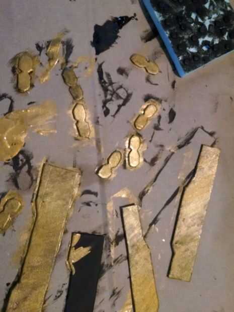 insumos para la cabeza de la pirámide:-2 cajas de cartón-cemento-tubo desague-las mangueras eléctricas-pintura de aerosol de cobre, plata, negro y marrón-papel de lija-tijeras, hojas de-pistola de pegamento-casco para el interior de la pirámide-doble
