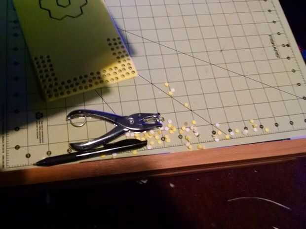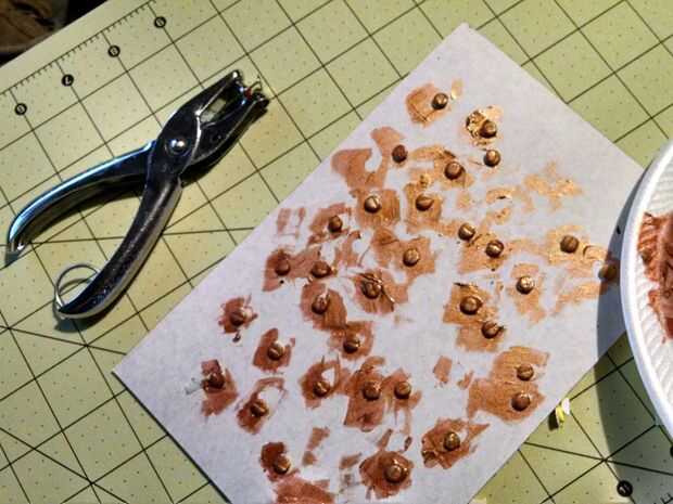Utilicé una perforadora en espuma pegajosa hoja trasera. Parte posterior pegajosa es bueno porque es difícil de utilizar un pegamento caliente pistola en piezas pequeñas. Corte algunos V fuera de la espuma y pintado. Asegúrese de usar mod podge para sellarlo y gloss encima.