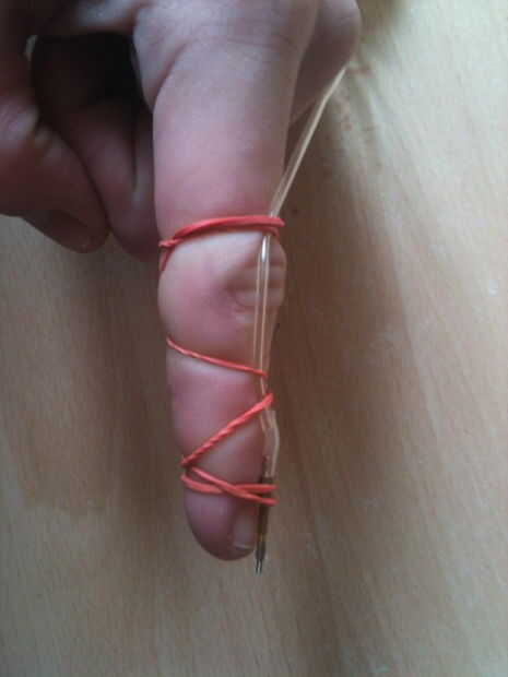 Esto, lamentablemente, es la más incómoda. Retire el tubo de Gas de la cámara de Gas y manténgalo en su deseado cuerpo parte (dedo índice derecho o izquierdo es mejor) con el metal extremo unos milímetros sobre el borde de la punta de su dedo. Use una banda elástica para mantener en su lugar. A continuación, prepárate otro elástico, descansar la cámara de Gas en su palma deseada y utilice la venda de elástico para mantenerlo allí.