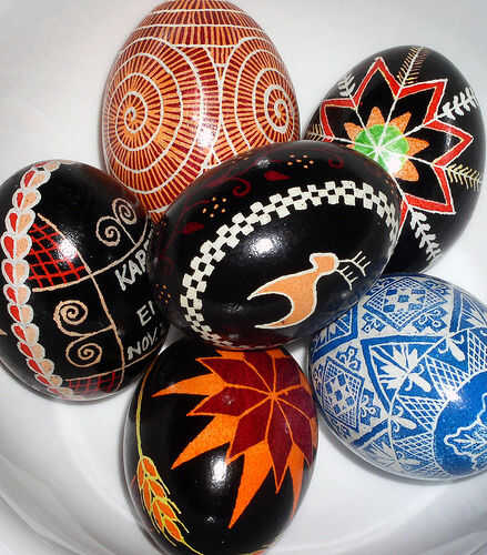 Pysanky es una artesanía tradicional en Ucrania y Polonia. El método es similar al batik - patrones se dibujan en el huevo con cera, que luego protege el tinte que se aplica a las áreas cubiertas. Repitiendo este proceso con distintos colores de tinte, se construye un patrón multicolor. Por último, la cera se quita para revelar los colores que se cubrieron para arriba en cada etapa. Puede Agregar una capa de poliuretano sobre el huevo acabado para proteger el diseño teñido y darle un acabado brillante.