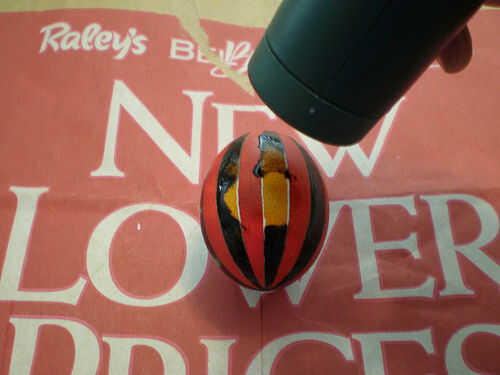 Debido al peligro de estropear el huevo de hollín, mi método preferido de eliminación de la cera es calentar el huevo con una pistola de calor diseñada para sellado de goma. Este método también permite que me quite la cera más rápidamente. Es un poco ligero de cocción de las tripas del huevo... pero no interfiere con soplar el huevo.