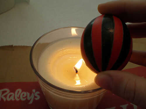 La manera tradicional para quitar la cera de los huevos es con el calor de una llama de vela. Mantenga el huevo cerca de la llama de la vela hasta que la cera se ablanda y luego limpie la cera derretida con una toalla de papel o un pañuelo de papel. Tenga cuidado de no sostener el huevo en o directamente sobre la llama! Sosteniendo el huevo en la llama puede transferir hollín sobre la superficie del huevo. Este hollín será casi imposible de quitar y puede arruinar un hermoso huevo.