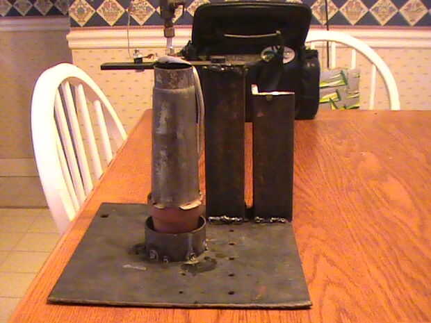 La cámara del horno es el elemento estructural más simple, principalmente porque fue el primer componente del proyecto construido. Es también totalmente construido con materiales rescatados. El hoyo del horno es una maceta de cerámica pequeños, la base de los cuales ha tenido vidrio vertido en él. Esto hace que para una cámara altamente termoresistentes y es ideal para la piscina de combustible. El cono es el cuerpo de una vieja pistola secado de pintura, y su forma la hacen ideal para canalizar el aire caliente ascendente en un área concentrado. También tiene una red construida en él, que es útil para colocar un crisol en el calor.