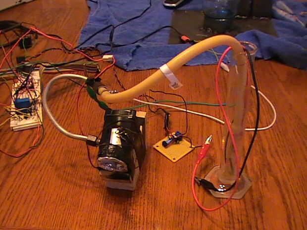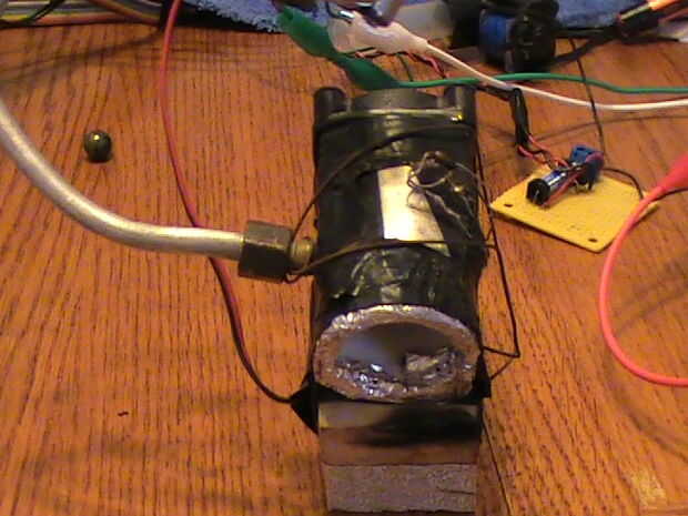 El ventilador en un viejo procesador-ventilador, que está sujeto a una plataforma de madera. Una longitud de tubo de PVC delgado forma el cañón del ventilador, que permite que el oxígeno se mezclan con el aire cuando se empuja en la cámara del horno. El ventilador no está conectado directamente a la cámara, por lo tanto, el ángulo del cañón, que permite el flujo de aire dirigido en la base de la cámara. La plataforma se puede colocar para un ángulo de ataque que produce los mejores resultados en el horno, temperatura de sabio. El posicionamiento si el ventilador es más un arte que una ciencia y viene con experiencia. Generalmente funciona mejor cuando los ángulos para que un vórtice se forma en el cono de explosión.