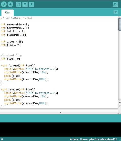 Usted tendrá que escribir algún código de Arduino que implementará la lógica de movimiento. La señal proveniente del programa de python es un número que corresponde a un mvment particular. Esto significa que un comando simplemente es cambiar el pin de salida de bajo a alto o de alto a bajo. Puede descargar CarControl completa de mi sitio Web.