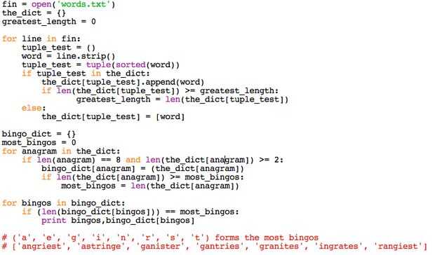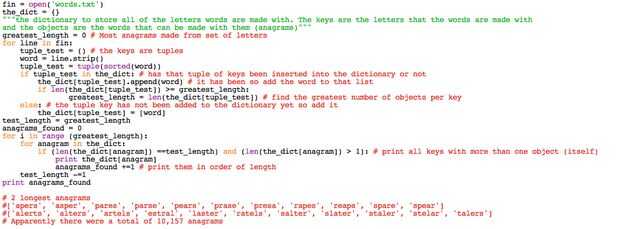 Este programa - una compilación de ellos todas las clases a través de la lista de la palabra entera 100.000 + palabras y ordena según los caracteres que se componen de. Sorprendentemente sólo se necesita Python aproximadamente 1,5 segundos para correr a través de todo el programa. Luego ordena los anagramas según el número de anagramas por conjunto de caracteres de mayor a menor. Por ejemplo de 'islt' pueden formar 'list' y 'limo'