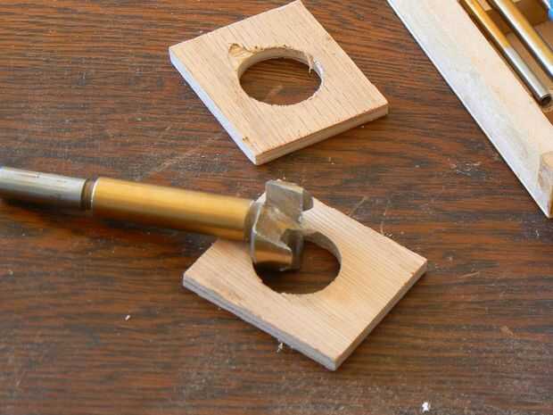 Para sostenerme hasta que consigue hecha la configuración del lanzador lujo o comprar algunos asegurables, taladré agujeros a través de algunos cuadrados de madera contrachapada fina que tenía por ahí con una broca Forstner. Una broca de pala funcionan bien también.