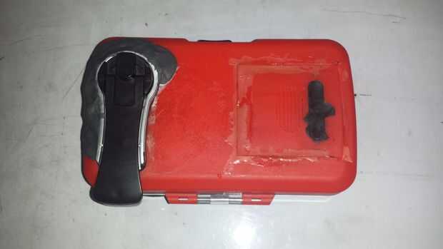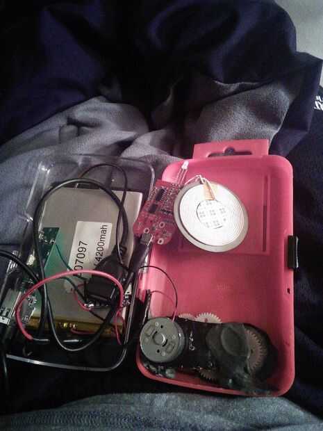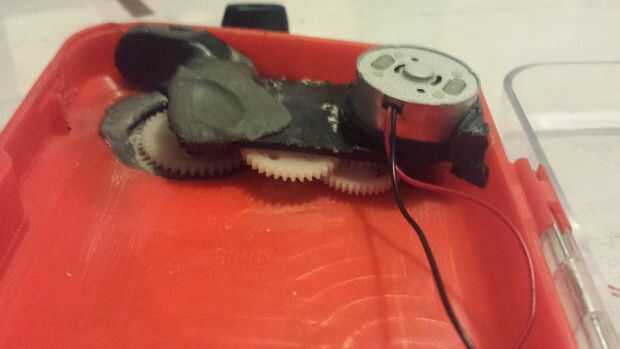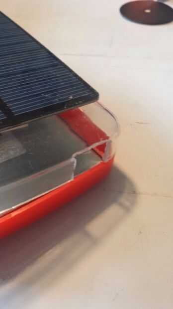 Taladro 2 agujeros pequeños para los cables del panel solar ir a través. Luego fije el panel con Sugru. Sugru funciona tan bien para esta parte porque se crea una cresta sólida protectora alrededor del panel, así como proporcionan una superficie antideslizante para la carga inalámbrica en el otro lado. Hacer un canto que es más alto que el panel, por lo que puede evitar rallar el panel si pasa de ese lado. Permitir la Sugru curar durante el tiempo especificado en el envase (24 horas, creo). Mientras tanto, usted puede cortar un agujero en el fondo de su caso para el dinamo. Desea el dínamo dentro de la caja y la manivela, así cortar lo suficiente del caso para permitir que los engranajes y el motor dentro. Asegure la dinamo con masilla epoxi. Este material cura rápidamente así que asegúrate de que tienes todo en su lugar y no hay ninguna masilla en los engranajes. Ayuda a girar la manivela mientras su curado para asegurar que el movimiento no está impedido.