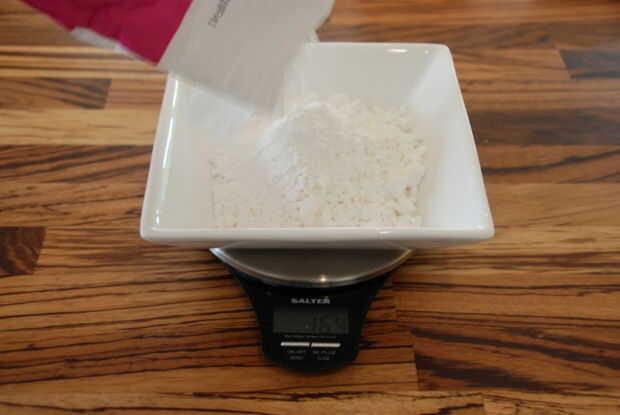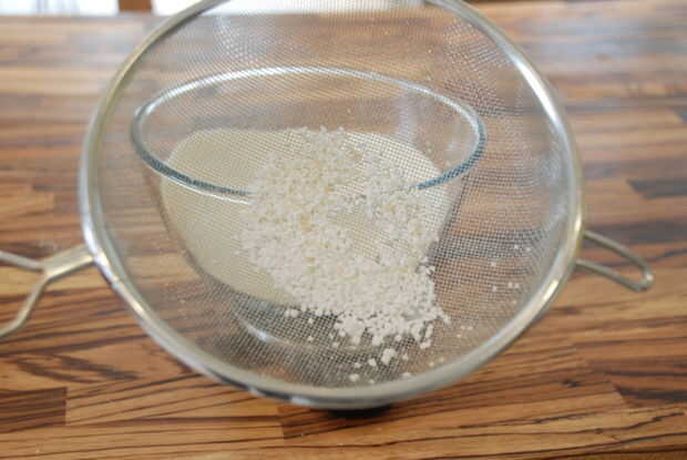 Este tamiz en un recipiente, desechando cualquier bultos que no pasen por el tamiz fácilmente.