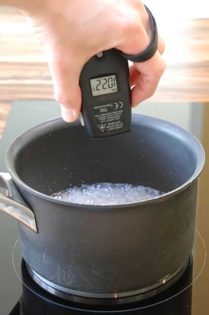 Cuando la temperatura del jarabe de azúcar alcanza 105° aumento la velocidad de la batidora.
