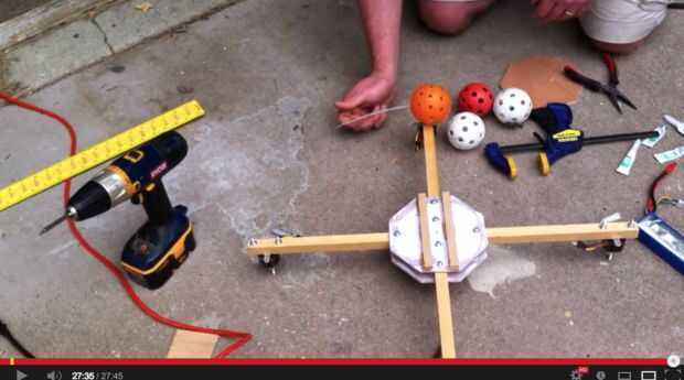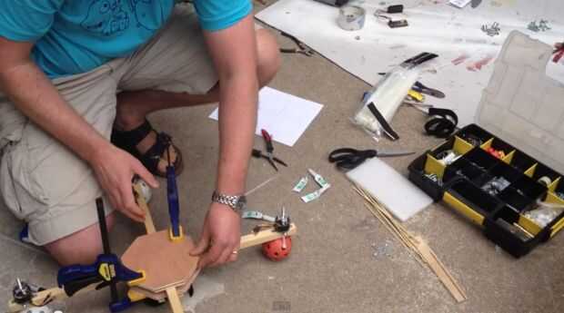 Para cada brazo, perno del motor en la bancada y perno de montaje del motor en el brazo. Utilizar abrazaderas de plástico para sujetar el tren de aterrizaje.
