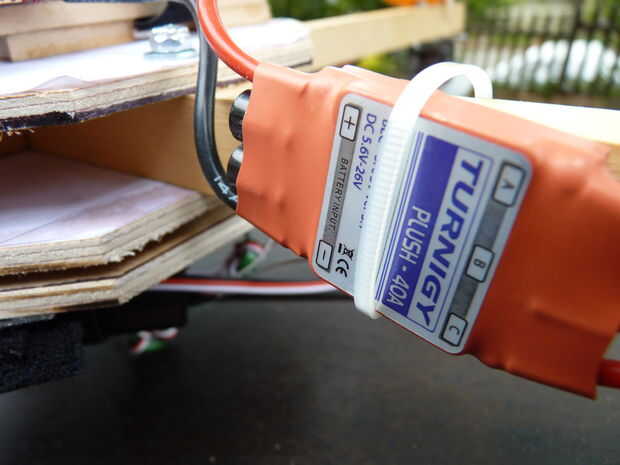 Para cada brazo, sujete la ESC al motor. El orden no importa en este momento, pero quizás tenga que cambiarlos cuando usted está configurando el controlador de vuelo. Fije los CES al brazo con ataduras de cremallera.