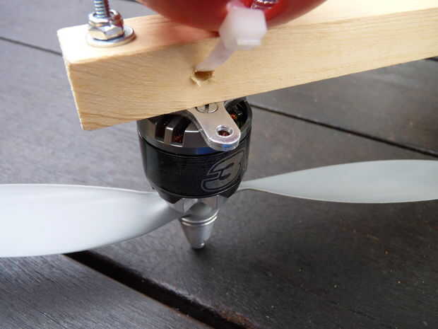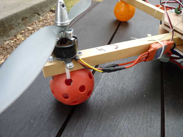 Para equilibrar los apoyos, ponerlos en un destornillador de modo que pueden girar libremente. Llevarlos a nivel horizontal, y debe mantener esa posición. Si un extremo se cuelga hacia abajo, es más pesado que el otro extremo. Poner un trozo pequeño de cinta adhesiva en el extremo posterior del lado luminoso y repita hasta que la hélice está equilibrada.