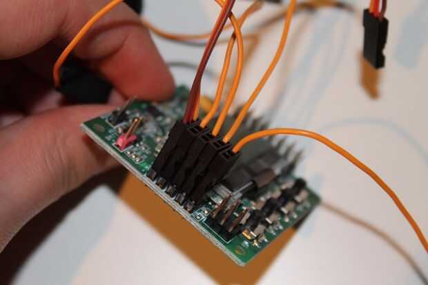 - Poner el cable de servo normal, que normal, en el primer canal en el lado izquierdo de la tarjeta de control de vuelo, los pines están alineados como esta: