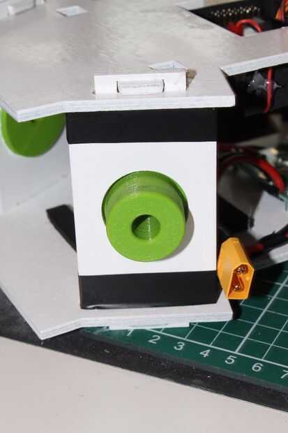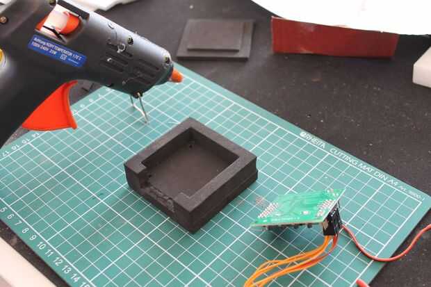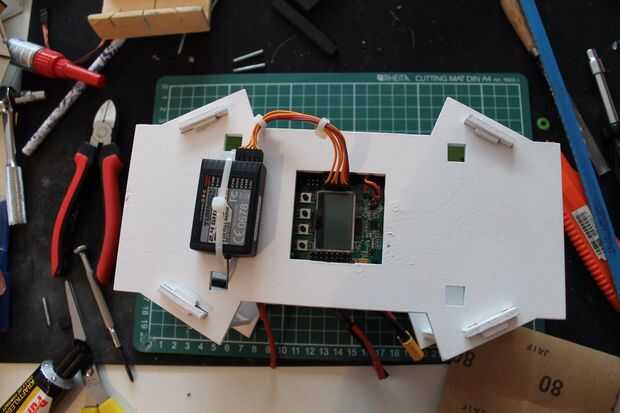 - Ahora use la pistola de pegamento caliente para fijar el tablero de control de vuelo al corte en la parte superior, la pequeña flecha que apuntando a la batería