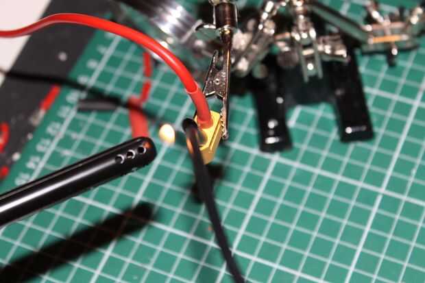 6. Hacer ahora lo contrario, poner un poco de soldadura en el lado - del conector XT60 e inserte el lado largo del cable negro.