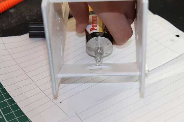 La estructura del edificio es muy simple también. Tomar las placas superior e inferior y simplemente deslice las piezas laterales por los agujeros. Para hacer todo robusto, coloque un poco de pegamento en la parte superior de la pieza lateral que quisiera tocar la pieza superior e inferior del marco. Para su información, utilicé pegamento de energía para este paso. Después de puede utilizar un poco de pegamento para las piezas de la cerradura pequeña y deslícelos en.