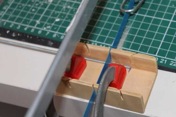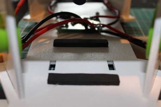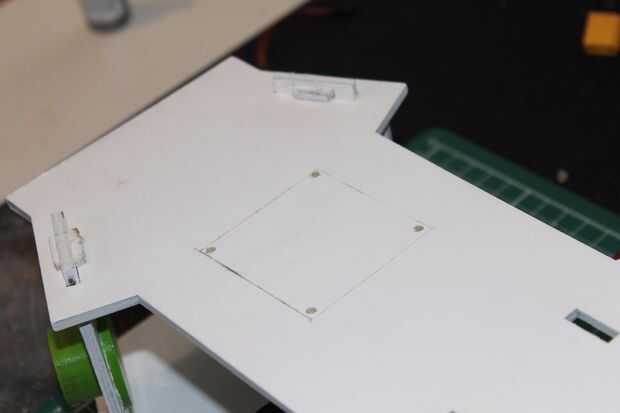 La batería se colocará en el lado con las dos ranuras. Se utiliza una correa de la batería para apretarlo. Sin embargo, para asegurar que la batería no se mueva alrededor usé la tapa de los envases de tablero de control de vuelo. Usando un cuchillo de precisión, corte dos esquinas. Entonces solía pegamento caliente para atarlos igualmente separados en el marco. Cuando escasea la correa de la batería, la batería estará bien en su lugar.