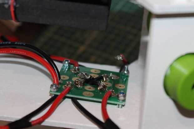 Vamos a seguir fijar el tablero de distribución de energía soldado antes. Para hacer esto, dosome mediciones en la parte inferior del marco y perfore cuatro agujeros de 3mm. Cortar cuatro varillas roscadas en piezas de 2 cm y utilizan dos tuercas de tornillo por barra. Después de esto Coloque el tablero de distribución de energía en la parte inferior del marco. Tenga en cuenta que la Junta no justo en el centro del marco. Antes de taladrar los agujeros, poner en la batería y la cámara para ver donde la junta necesita puede colocarse para que el quadcopter es equilibrado.
