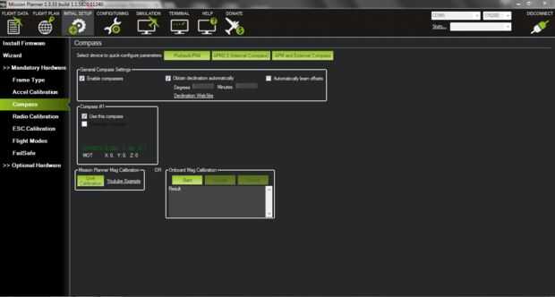 Después de cargar el código abrir el planificador de misión y presione conectar a 115200 baudios. Para la configuración y setup inicial puede hacer clic en el enlace de la primera. Calibre magetometer, acelerómetro, radio etc..