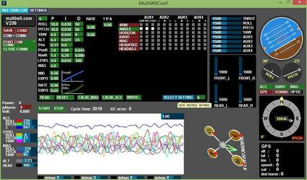 Asegúrese de que el quadcopter es sobre una superficie plana y haga clic en el botón CALIB_ACC para calibrar el acelerómetro. No mueva el quadcopter en 5 seg. Haga clic en el botón CALIB_MAG para calibrar el magnetómetro. En los próximos 30secs, agarrar el quadcopter y rotarlo varias veces en cada eje. Haga clic en el botón WRITE para guardar los datos. Haga clic en configuración-escoger-, pueden fijar distintos parámetros y aparecerá el estatus del quadcopter.