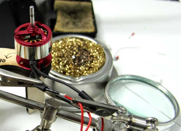 Empezar a conectar los tres cables del motor al azar a los tres cables de salida, y luego verifique que la dirección de rotación se coloca en los brazos de flone es lo mismo que los motores. Si es soldadura de wright los cables en ese orden, si no cambiar el orden, conecte la batería y encienda el motor nuevamente.